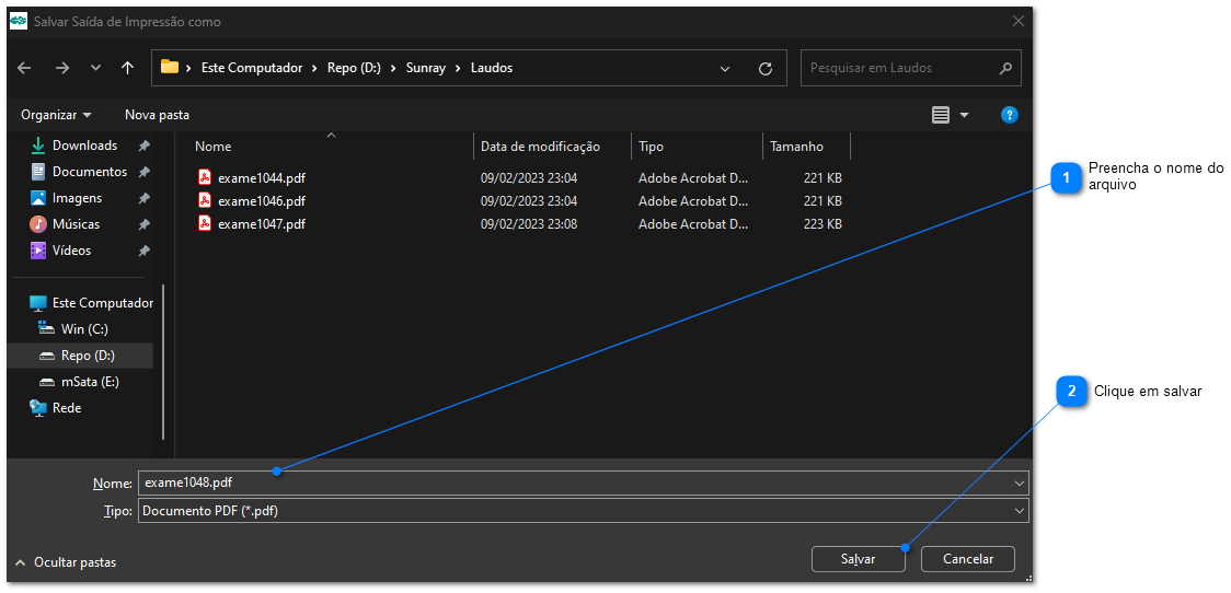 Impressão do exame no formato PDF, o exame deve ser salvo no repositório configurado no sistema de monitoramento